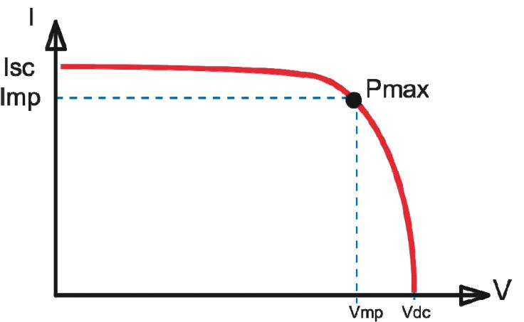 Isc - I short-circuit - short-circuit current - Tok kratkega stika Pmax - nominal maximum power at STC - Maksimalna moč modula Voc - V Open-Circuit - Open-Circuit Voltage - Napetost odprtih sponk Imp - I max_peek - max_peek current - Tok maksimalne moči Vmp - V max_peek - max_peek voltage - Napetost maksimalne moči
