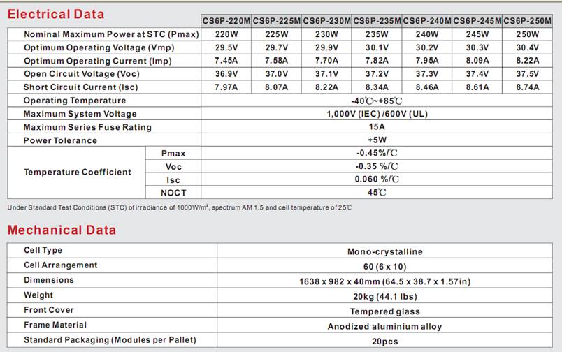 Nominal Maximum Power at STC (Pmax) - nominalna maksimalna moč fotovoltaičnega modula pri STC Pmax - P = U x I x cos φ Optimum Operating Voltage - optimalna napetost fotovoltaičnega modula (Vmp) Vmp - napetost maksimalne moči (V max peek) Optimum Operating Current - optimalni tok fotovoltaičnega modula (Imp) Imp - tok maksimalne moči (I max peek) Open Circuit Voltage - napetost odprtih sponk (Voc) Short Circuit Current - tok kratkega stika (Isc) Operatin Temperature - tempetatura okolja ki še zagotavlja delovanje fotovotaičnega modula Maximum System Voltage - maksimalna napetost sistema (1000V po IEC) in (600V po UL) Maximum Series Fuze Rating - maksimaln nazivni tok varovalke power Tolerance - toleranca nazivne moči