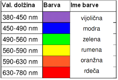 Svetloba je elektromagnetno valovanje. Med valovno dolžino 380 nm in 780 nm je svetloba vidna za človeško oko. Nad mejo 780 nm je infrardeča svetloba, pod mejo 380 nm pa je ultravijolična. Barva vidne svetlobe je podana v spodnji tabeli: